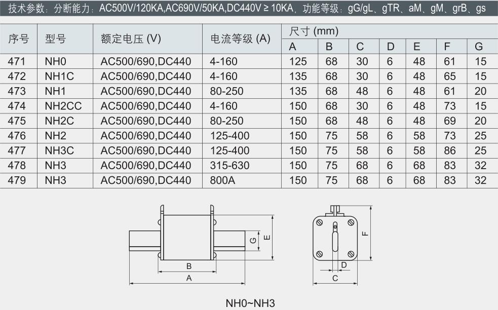 由純銀片制成的變截面熔體封裝于由高強(qiáng)度瓷制成的熔管內(nèi);熔管中充滿經(jīng)化學(xué)處理過(guò)的高純度石英砂作為滅弧介質(zhì);熔體二端采用點(diǎn)焊與觸頭牢固電連接。熔斷體型式有方管刀形觸頭和方管平板形觸頭兩種。熔斷體可帶指示器或撞擊器,當(dāng)熔體熔 斷時(shí),指示器/ 撞擊器立即動(dòng)作,顯示熔斷體已熔斷( 指示器)并推動(dòng)微動(dòng)開關(guān)( 撞擊器),發(fā)出各種信號(hào)或自動(dòng)切換電路。 本系列熔斷體適用于交流50Hz、額定電壓至2000V、額定電流至2500A,主要用在電氣線路中作為半導(dǎo)體設(shè)備的短路保護(hù) (aR)。 本系列熔斷體額定分?jǐn)嗄芰χ?00kA。 本系列熔斷體符合國(guó)家標(biāo)準(zhǔn)GB13539.1、GB/T13539.4 和國(guó)際電工委標(biāo)準(zhǔn)IEC60269-1、IEC60269-4。