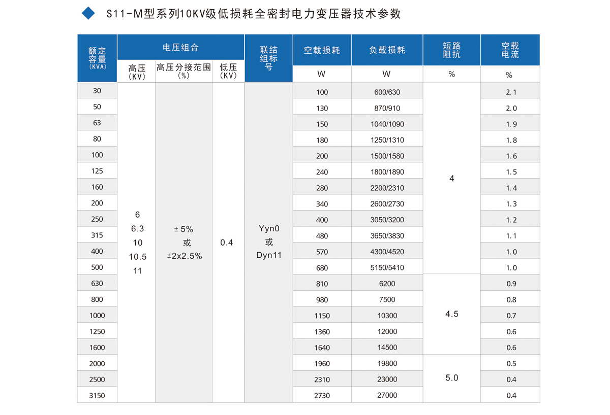 產(chǎn)品介紹 公司生產(chǎn)的S11-10KV級(jí)系列三相油浸無勵(lì)磁調(diào)壓配電變壓器,具有高效率、低損耗的特點(diǎn),可節(jié)省大量的電耗和運(yùn)行費(fèi)用,社會(huì)效益顯著,是國家推廣的高新技術(shù)產(chǎn)品。 該變壓器器身采用了新型絕緣結(jié)構(gòu),提高了抗短路能力; 該變壓器鐵芯由高質(zhì)量冷軋硅鋼鋼片制成; 該變壓器高、低壓繞組均選用優(yōu)質(zhì)無氧銅線,并采用多層圓筒式結(jié)構(gòu); 該變壓器所有緊固件均采用特殊防松處理; 該變壓器油箱為波紋式結(jié)構(gòu),箱蓋和箱沿為完全焊死或以螺栓緊固兩種; 型式,從根本上延長(zhǎng)了變壓器油及絕緣材料的使用壽命。 以上標(biāo)準(zhǔn)以最新發(fā)布信息為準(zhǔn);設(shè)備要求應(yīng)以相應(yīng)的最新國家做專業(yè)標(biāo)準(zhǔn)為準(zhǔn)。 運(yùn)行條件 海拔不超過1000m戶內(nèi)或戶外 最高環(huán)境氣溫+40C 最高日平均氣溫+30℃ 最高年平均氣溫+20C 最高低溫-25C 根據(jù)客戶要求可提供在特殊條件下運(yùn)行的變壓器。 執(zhí)行標(biāo)準(zhǔn) GB1094.1~2-1996電力變壓器 GB/T6451-2008三相油浸式電力變壓器技術(shù)參數(shù)和要求 GB1094.3-2003電力變壓器