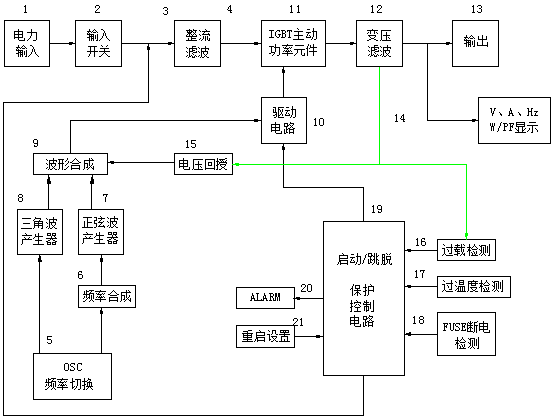 控制系統(tǒng)原理 穩(wěn)頻穩(wěn)壓電源控制系統(tǒng)主要由信號發(fā)生單元,SPWM波生成單元,反饋控制單元,顯示單元,邏輯控制單元,保護(hù)單元,六大單元構(gòu)成。每個(gè)單元分別由電路功能模塊組成: 信號發(fā)生單元包含:基準(zhǔn)頻率產(chǎn)生電路,正弦波產(chǎn)生電路 SPWM波生成單元包含:三角波產(chǎn)生電路,SPWM波合成電路 反饋控制單元包含:電壓負(fù)反饋電路 顯示單元包含:電壓、頻率、電流、功率/功率因數(shù)顯示電路 控制邏輯單元包含:軟啟動電路,故障中斷處理電路,RESET電路 保護(hù)單元包含:過載偵測電路,過電壓偵測電路,過熱偵測電路,過流偵測電路,保險(xiǎn)絲斷偵測電路 系統(tǒng)功能框圖 穩(wěn)頻穩(wěn)壓電源控制系統(tǒng)按功能順序從輸入到輸出還可分為21項(xiàng)功能單元。