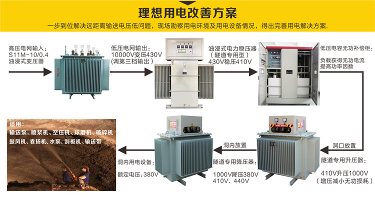 隧道施工專用升壓變壓器(100KVA-2000KVA)本產(chǎn)品可解決因電網(wǎng)電壓低于300v,甚至更低,線路過長導(dǎo)致電壓過低,設(shè)備過多導(dǎo)致所有設(shè)備不能正常啟動使用,使用隧道專用升壓器可將電壓升至380-450v,使用電設(shè)備正常啟動和工作。特別適用于工廠、礦山、公路、鐵路、隧道、灌溉等電壓過低的場所邊遠(yuǎn)山區(qū)選礦區(qū)、礦井、隧道等企業(yè)各類的機(jī)電設(shè)備如破碎機(jī)、球磨機(jī)、刮板機(jī)、輸送帶、水泥輸送泵、空壓機(jī)、絞車、選礦設(shè)備或隧道挖掘設(shè)備、噴漿機(jī)、隧道掘進(jìn)機(jī)等。因電源供電距離遠(yuǎn),線路損耗大所造成的電壓降低,從而使各類礦用機(jī)電設(shè)備無法正常啟動工作,甚至燒毀各種礦用機(jī)電設(shè)備。隧道礦機(jī)專用自動升壓器具有升壓范圍廣等特點(diǎn),可以將電源電壓(240V-430V)自動穩(wěn)定在(400V)輸出。使電源末端各類礦用機(jī)電設(shè)備正常工作。需求其他電壓,可定做。