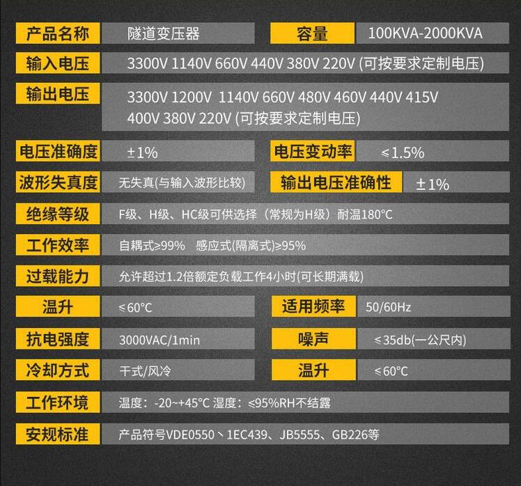 本企業(yè)已通過ISO9001-2008質(zhì)量體系認(rèn)證,產(chǎn)品通過CE認(rèn)證 地址:上海松江區(qū)廣富林路156號(hào) 銷售熱線:021-51095208田經(jīng)理: 18016201838 公司承諾:全部產(chǎn)品保質(zhì)一年!在正常使用的情況下一年內(nèi)發(fā)生質(zhì)量問題可免費(fèi)更換!(客戶特殊要求除外) 隧道專用升壓變壓器產(chǎn)品主要特點(diǎn)與性能