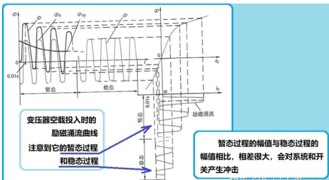 圖1:變壓器的勵(lì)磁涌流 變壓器的勵(lì)磁涌流比變壓器正常運(yùn)行電流大很多倍,且存在過渡時(shí)間。如果開關(guān)選配的不合適,當(dāng)然在開機(jī)送電一刻開關(guān)就跳閘了。