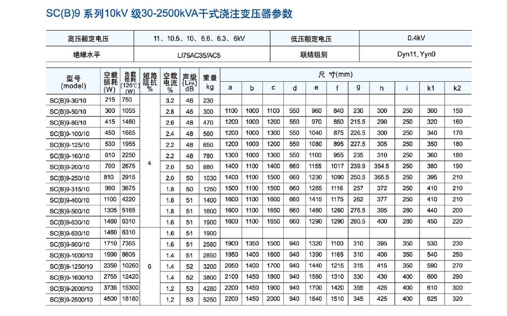 產(chǎn)品標(biāo)準(zhǔn)及規(guī)范 1、標(biāo)準(zhǔn):GB1094、GB6450-86、GB/T10228-1997、符合DIN42523、IEC726 2、容量范圍:30-16000kVA 3、電壓等級(jí):10KV、35kV 4、調(diào)壓方式:無(wú)勵(lì)磁調(diào)壓或有載調(diào)壓 5、分接范圍:±5%、±2X 2.5%、±4X2.5% 6、頻率:50Hz或60Hz 7、相數(shù):三相或單相 8、聯(lián)結(jié)組標(biāo)號(hào):Yyn0、Dyn11或其它 9、短路阻抗:標(biāo)準(zhǔn)阻抗 1O、海拔小于1000m,環(huán)境溫度低于40度,超過(guò)上述使用條件時(shí),應(yīng)按照標(biāo)準(zhǔn)做相應(yīng)的定額調(diào)整 11、最高溫升:100K 12、冷卻方式:自冷(AN)或風(fēng)冷(AF) 13、防護(hù)等級(jí):IP00,IP20,IP23 14、絕緣等級(jí):F級(jí) 15、絕緣水平: SCB10-400KW500KW630W多少錢(qián)一臺(tái)¥什么價(jià)格?萬(wàn)元 (1)10kV級(jí)產(chǎn)品工頻耐壓35kV,雷電沖擊電壓75kV (2)20 kV級(jí)產(chǎn)品工頻耐壓50kV,雷電沖擊電壓125kV (3)35kV級(jí)產(chǎn)品工頻耐壓70kV,雷電;中擊電壓170KV