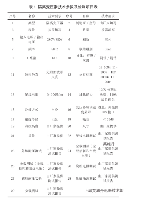 表1隔離變壓器技術(shù)參數(shù)及檢測(cè)項(xiàng)目表