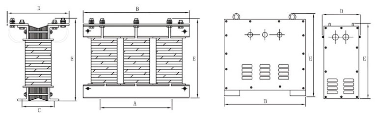 一、380V升415V750V800V1140V升壓變壓器概述 SG系列三相干式變壓器廣泛適用于交流50~60Hz,輸入、輸出電壓不超過1000V的各種三相供電場(chǎng)合。產(chǎn)品的各種輸入、輸出電壓的高低、聯(lián)接組別、調(diào)節(jié)抽頭的多少及位置(一般為土5%)、繞組容量的分配、次級(jí)單相繞組的配備、整流電路的運(yùn)用、是否要求帶外殼等,均可根據(jù)用戶的要求進(jìn)行精心的設(shè)計(jì)與制造;ZSG系列三相干式整流變壓器供整流設(shè)備、整流后作充電、電壓調(diào)節(jié)及直流電源之用。 二、型號(hào)及其含義 三、外型及安裝尺寸 | 型號(hào) | 外形尺寸(開啟式) | 安裝孔距 | 外形尺寸(防護(hù)式) | | B × D × E | A × C | B × D × E | | SG-1KVA | 200×150×210 | 180×120 | 310×280×300 | | SG-1.5KVA | 240×150×230 | 180×120 | 350×300×360 | | SG-2KVA | 240×160×230 | 180×150 | 350×300×360 | | SG-3KVA | 250×180×230 | 180×170 | 350×300×360 | | SG-4KVA | 300×180×280 | 220×180 | 400×350×410 | | SG-5KVA | 300×200×280 | 220×200 | 400×350×410 | | SG-7KVA | 380×200×350 | 280×180 | 500×400×480 | | SG-8KVA | 380×220×350 | 280×190 | 500×400×480 | | SG-10KVA | 380×240×350 | 280×220 | 500×400×480 | | SG-15KVA | 420×220×400 | 280×220 | 600×500×580 | | SG-20KVA | 420×240×410 | 280×260 | 600×500×580 | | SG-30KVA | 480×260×460 | 320×260 | 600×500×580 | | SG-40KVA | 530×320×500 | 320×280 | 750×600×720 | | SG-50KVA | 530×350×520 | 450×260 | 750×600×720 | | SG-80KVA | 630×400×580 | 450×280 | 850×650×820 | | SG-100KVA | 720×500×650 | 550×350 | 950×700×850 | | SG-200KVA | 850×550×700 | 600×400 | 1100×800×1000 | | SG-300KVA | 1000×650×800 | 680×420 | 1200×800×1100 |