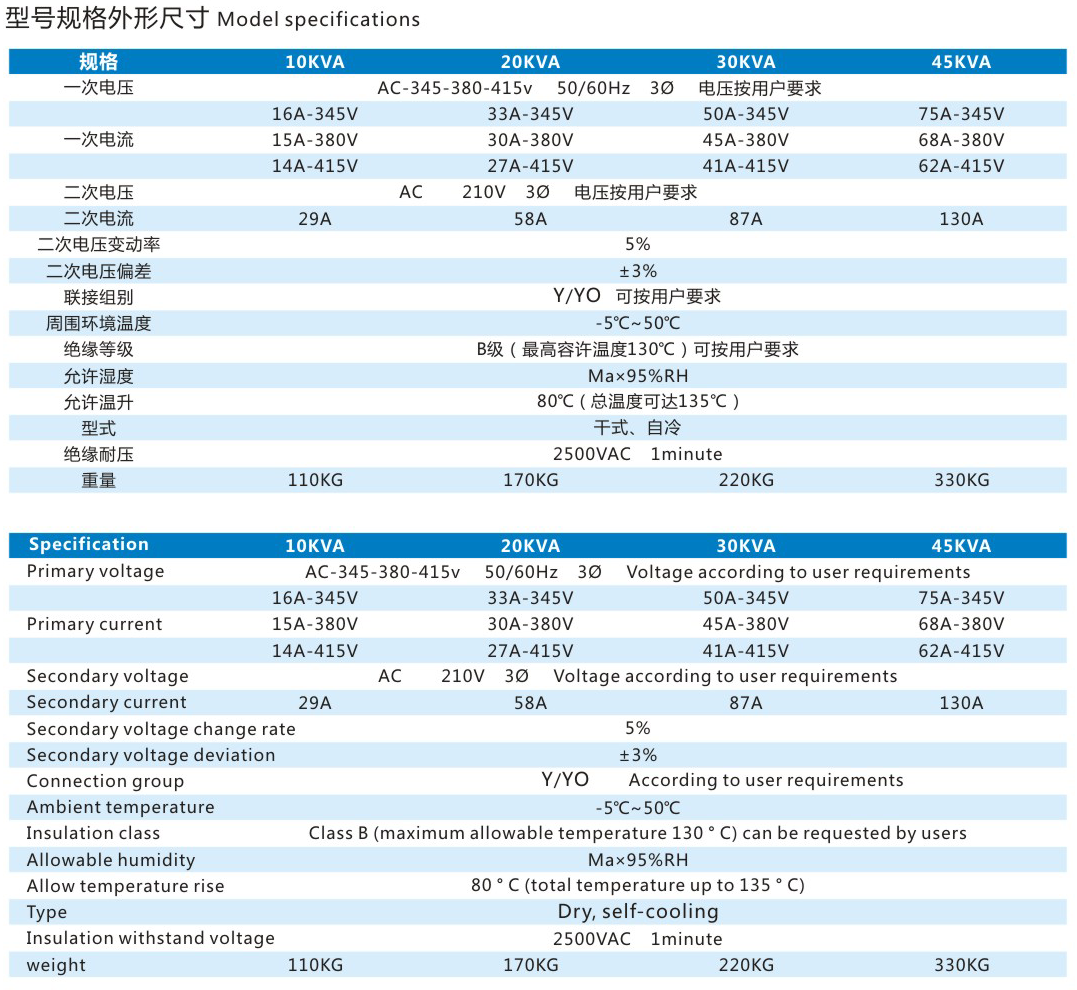 三相電380V變200V變壓器,380V變220V產(chǎn)品特性 SGS系列三相干式變壓器為SG的延伸產(chǎn)品,廣泛應(yīng)用于各類數(shù)控機(jī)床、加工中心、自動(dòng)化控制、數(shù)控設(shè)備的伺服系統(tǒng)和主軸電機(jī)的電壓變換,及控制電源之用;可與發(fā)那科、西門子、松下、三菱、華中、凱恩帝、航天等數(shù)控伺服系統(tǒng)、伺服電機(jī)、主國(guó)同電機(jī)匹配使用。 特點(diǎn): ·防護(hù)等級(jí)高,達(dá)到IP144; ·絕緣等高、過(guò)載能力強(qiáng); ·國(guó)內(nèi)首次以 NOMEX紙作為絕緣系統(tǒng) ·柜體采用模聲式拆裝,安裝方便、快捷; ·采用穿心螺杄結(jié)構(gòu),降低噪音效果明顯; ·線圈采用多次浸漆,電氣和機(jī)械聯(lián)接件采用特殊工藝; 變壓器材料配置說(shuō)明: ①鐵芯 采用全新優(yōu)質(zhì)高硅硅鋼片,主要材質(zhì)為0.35厚H18、H14、H12、Z11的優(yōu)質(zhì)硅鋼片,我們根據(jù)客房的要求和使用條件,選用最合適之材料,使變壓器性能設(shè)計(jì)達(dá)到最佳。(常規(guī)材料為全新優(yōu)質(zhì)硅鋼片)。 ②線材 采用PEW、UEW、EIW、SEIW、FEAI漆包線以及玻璃絲包線,耐溫等級(jí)為F級(jí)(155℃)、H級(jí)(180℃)、HC級(jí)(200℃)、C級(jí)(220℃)。(常規(guī)耐溫等級(jí)為H級(jí)180℃)。 ③絕緣材料 采用耐高溫絕緣紙為絕緣材料,具備高溫絕緣、阻燃和耐潮濕多重性能。 ④絕緣材料接線端子排 小功率采用端子排,外型美觀,有優(yōu)良的耐壓,耐溫,阻燃性能。大功率采用優(yōu)質(zhì)銅排。 ⑤鐵腳 主要采用數(shù)控折彎冷扎板,有鍍五彩(金黃),藍(lán)鋅(銀白)、白鋅(象牙白)、表面陽(yáng)極處理(黑色)等環(huán)保電鍍可供選擇。
